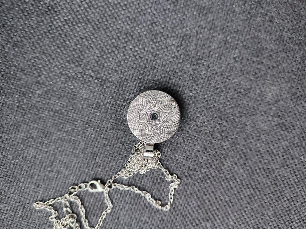Piccolo. Non c'è un bellissimo effetto iridescente come nella foto. Basta un pezzo di carta posto sotto un vetro leggermente convesso. La catena è corta.