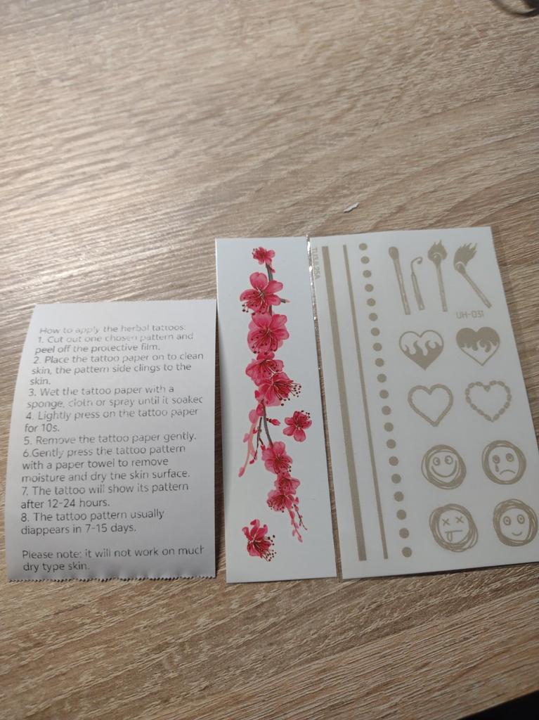 Non l'ho ancora provato, spero che vada tutto bene 😉 Aggiungo una recensione: sembra un vero tatuaggio. Per me è durato 5 giorni, poi l'ho strofinato accuratamente con una spugna e si è asportato. Nella foto, dall'alto - subito dopo l'applicazione, al centro - il giorno successivo e dal basso - dopo 5 giorni, dopo un accurato lavaggio. Un metodo interessante per chi non ha ancora deciso se vuole tatuarsi oppure no 🤓