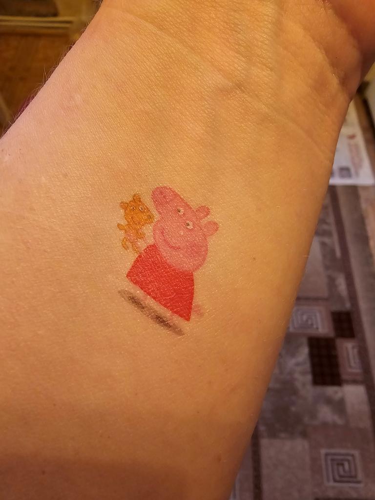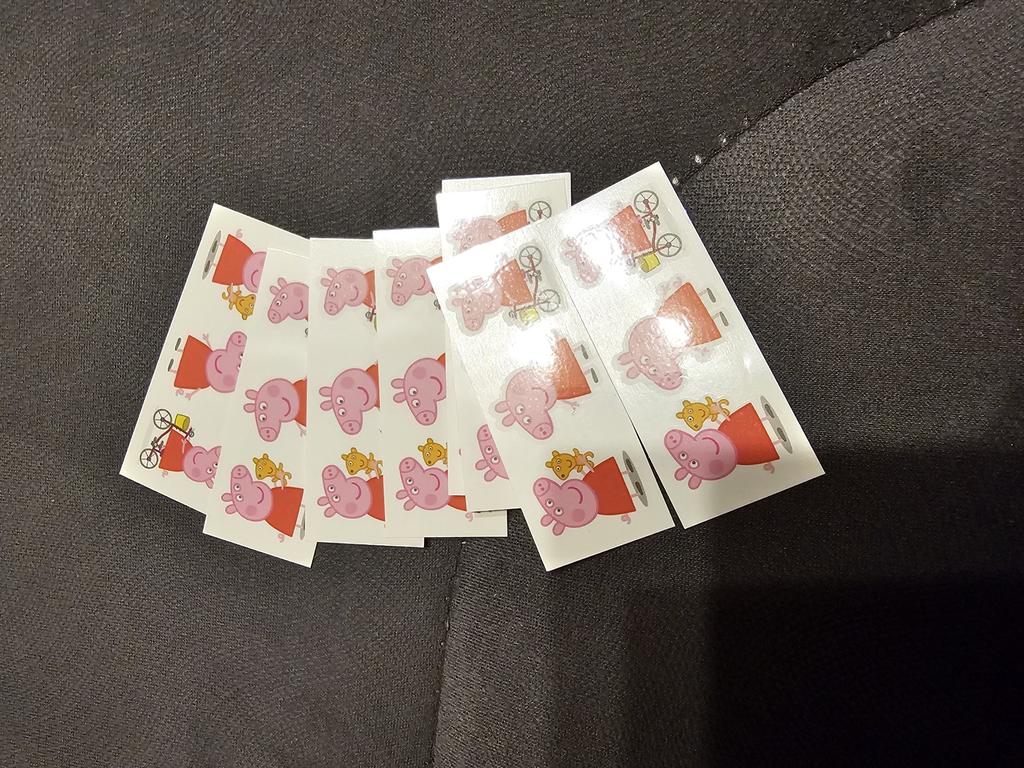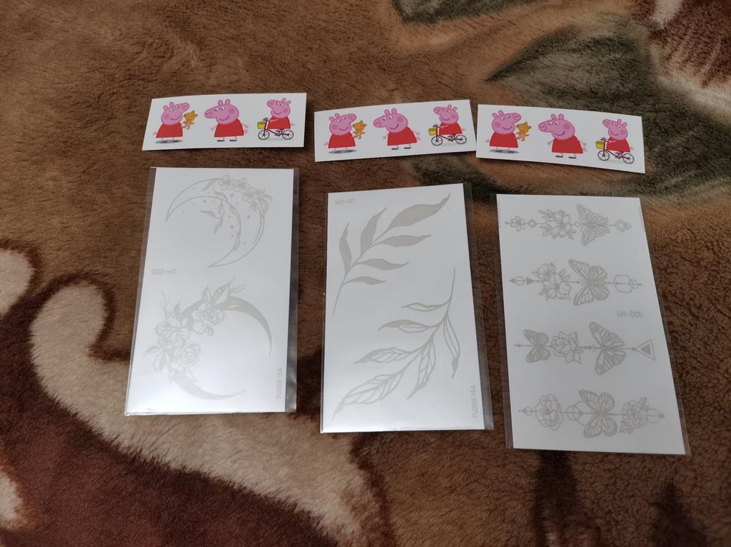 Ogni set include tre adesivi di Peppa Pig in regalo. A differenza degli adesivi principali, appaiono immediatamente. Bisogna rimuovere la pellicola, applicarla sulla pelle, ricoprirla d'acqua, premere con forza e rimuovere la carta.