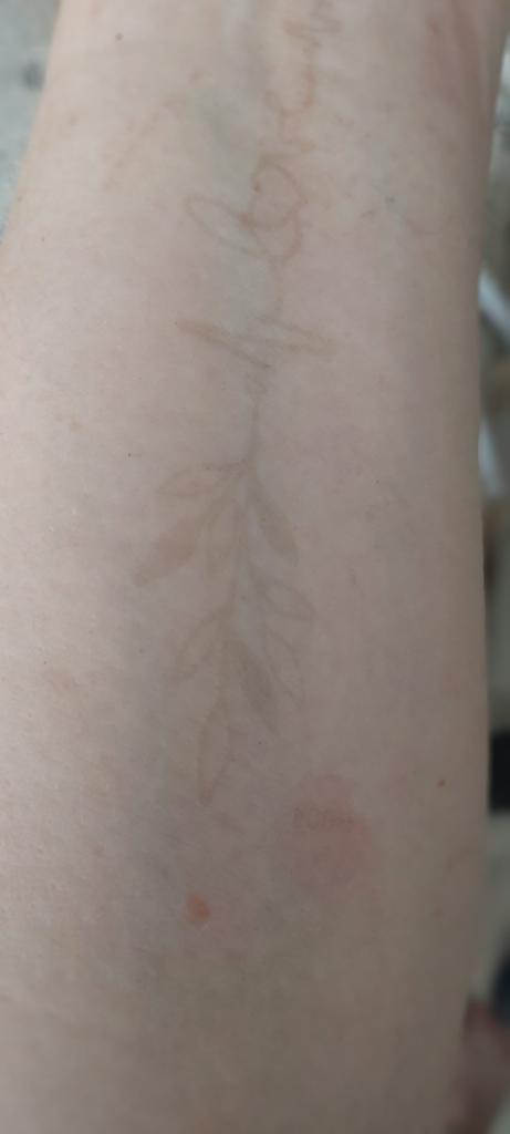 Tutto è come descritto: la prima foto è stata scattata subito dopo l'applicazione, la foto 3 è del 4° giorno. Grazie per i tatuaggi regalo con farfalle colorate)