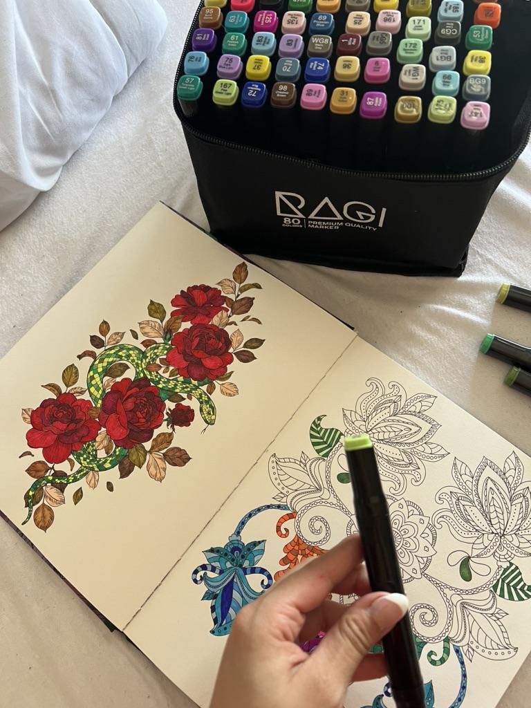 Tutti i pennarelli sono riempiti con inchiostro a base di alcool. I pennarelli ad alcool consentono di sovrapporre i colori, creare colori e sfumature diverse. Ti consentono di utilizzare la tecnica di fusione e ombreggiatura. Le penne riempiono l'illustrazione senza striature.