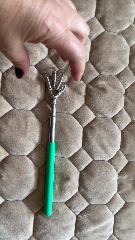 Buon grattaschiena. Ne avevo uno di plastica a forma di mano, ma era corto e grattava male.