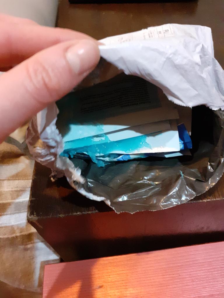 Un pacco era strappato sulla cucitura, la colla si era sparsa dappertutto.