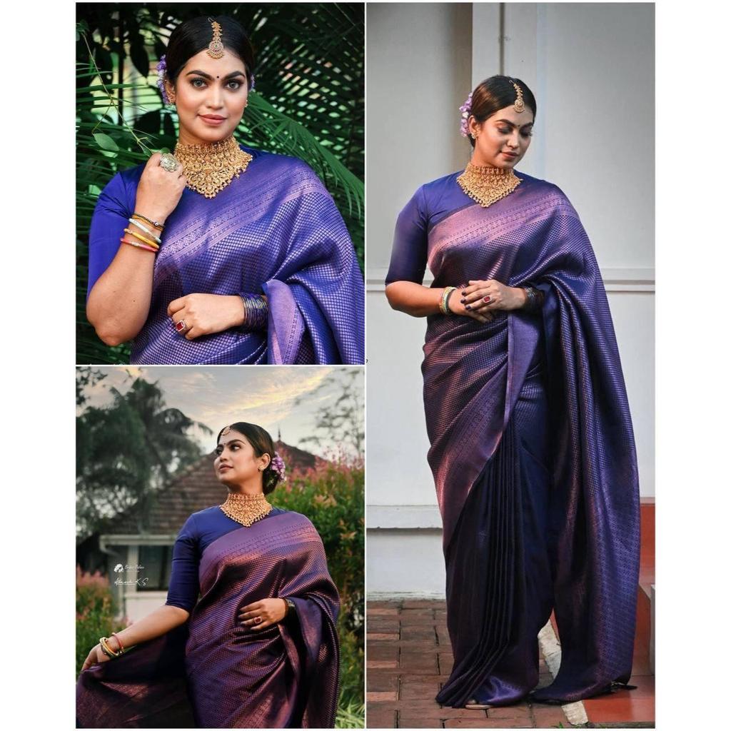 Il sari di seta del negozio ALMAARI è decorato con bellissimi lavori Zari sotto forma di motivi tradizionali.