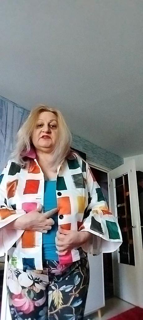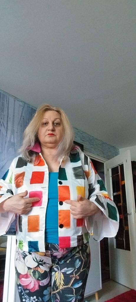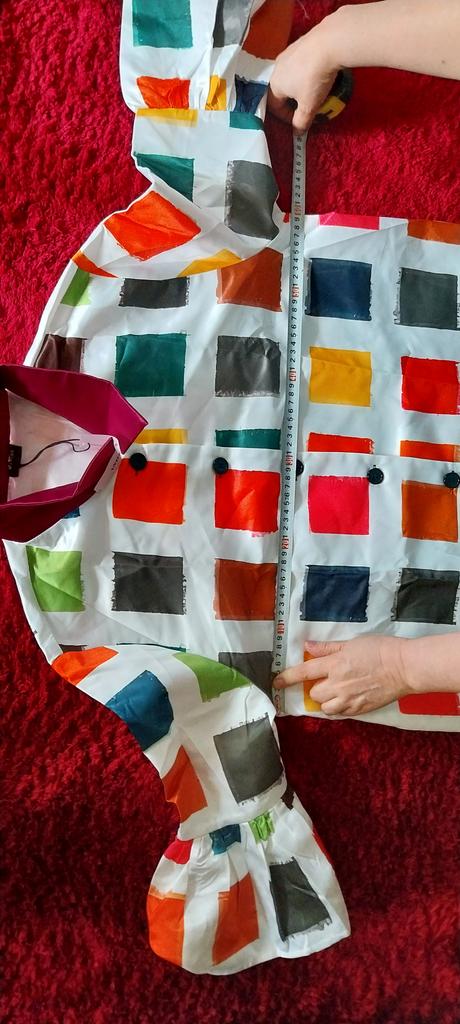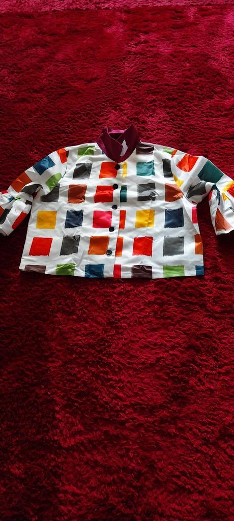 Giacca come nella foto, solo che davanti ci sono pochi quadrati colorati, tutti rossi uniti, mentre sulla schiena sono multicolore. La schiena è più bella del davanti. Peccato, sarebbe stato meglio il contrario