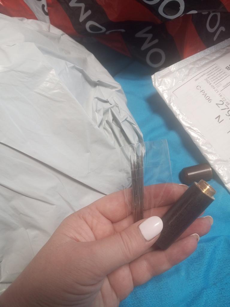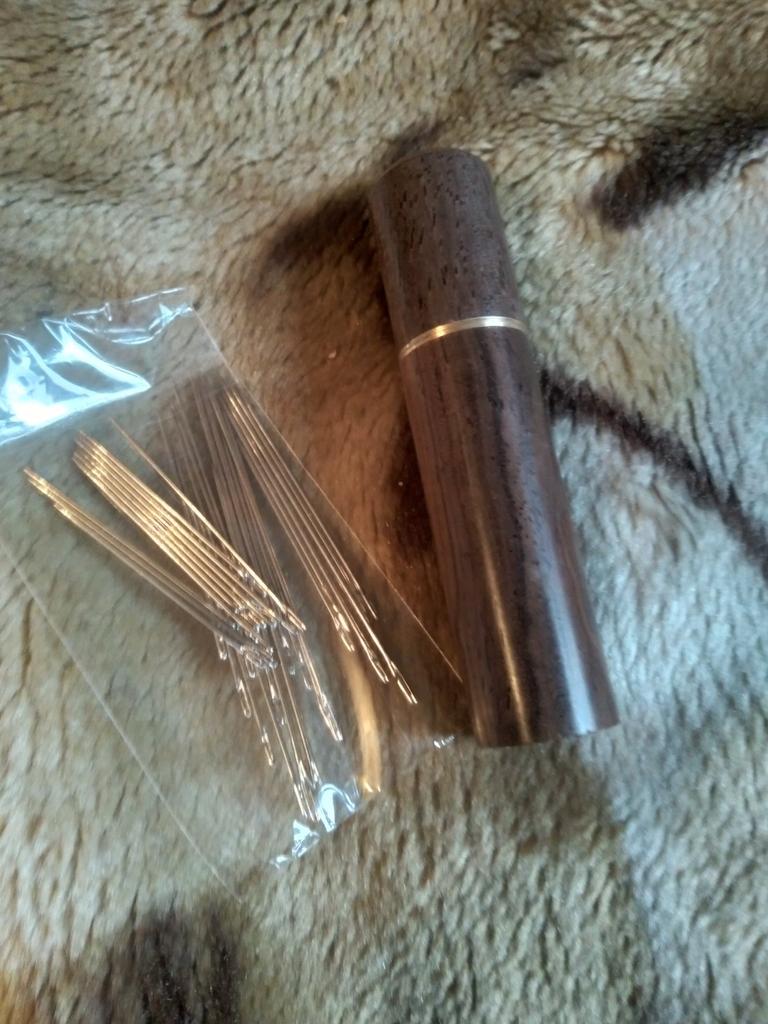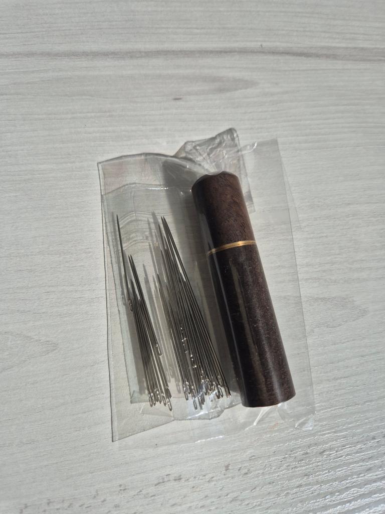 Ci sono aghi grandi e piccoli insieme in un tubo di metallo di alta qualità. È scomodo: devi svuotare tutto ogni volta. Comodo da riporre.