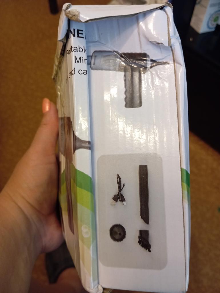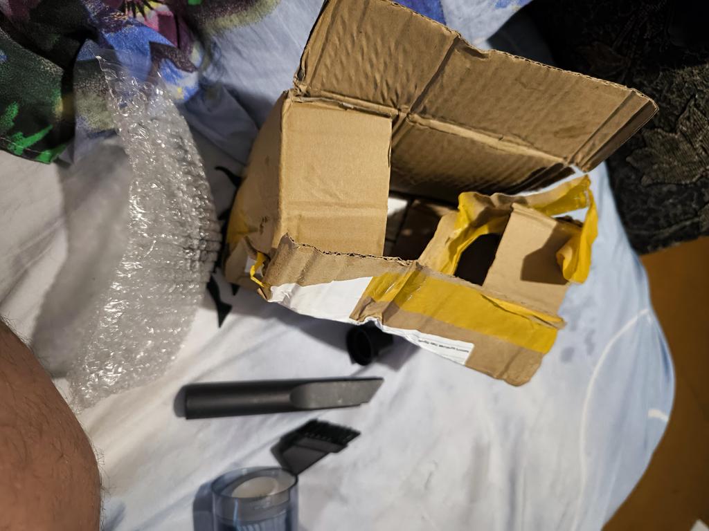 Non aspira piccoli detriti e polvere. Soffia via a malapena la polvere dalla superficie. Molto piccolo. Arriva in una scatola ammaccata, ma intero