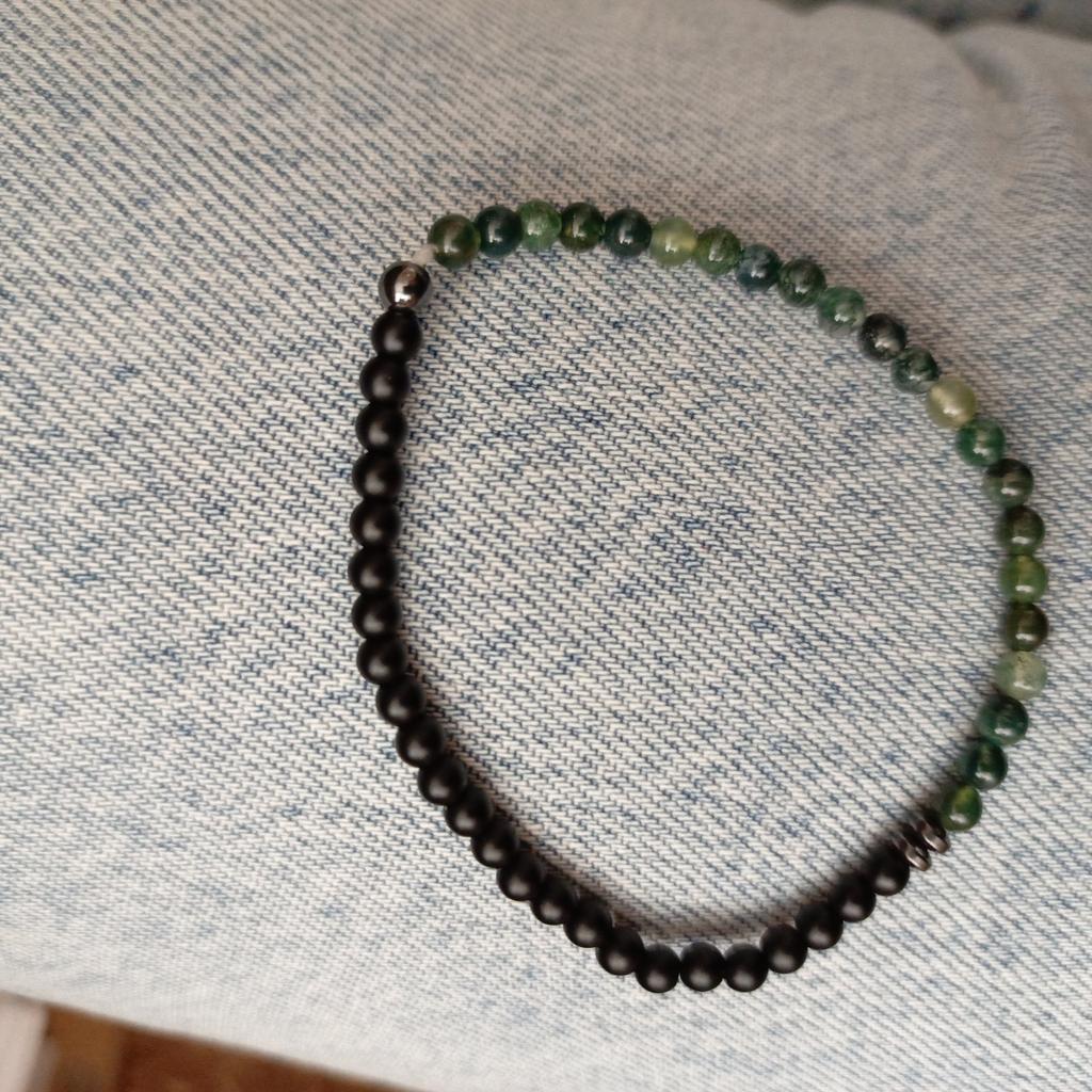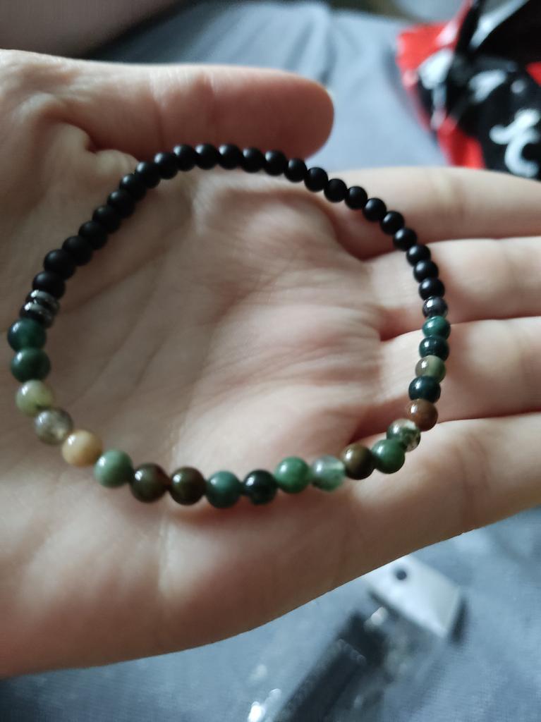 La mia agata muschiosa preferita in combinazione con perline nere (non conosco il nome) Separa perline di agata muschiosa e perline nere di ematite, ma una rotonda da un lato, due piatte dall'altro. (?) è esattamente come mostrato nella foto del venditore, non ho prestato attenzione a tale sfumatura al momento dell'ordine. Grazie al venditore, Jum e al servizio di consegna.