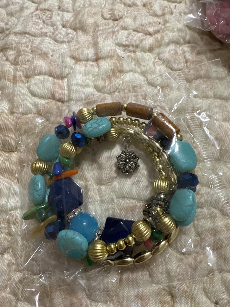 Un bellissimo bracciale, fissato da una base di filo, senza chiusura. Adatto a qualsiasi mano.