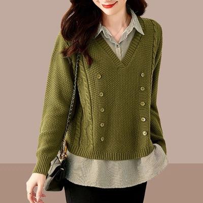 Maglione alla Moda Finto Due Pezzi Lavorato a Maglia Camicia Ampia Slim Elegante Top Casual per Primavera Autunno