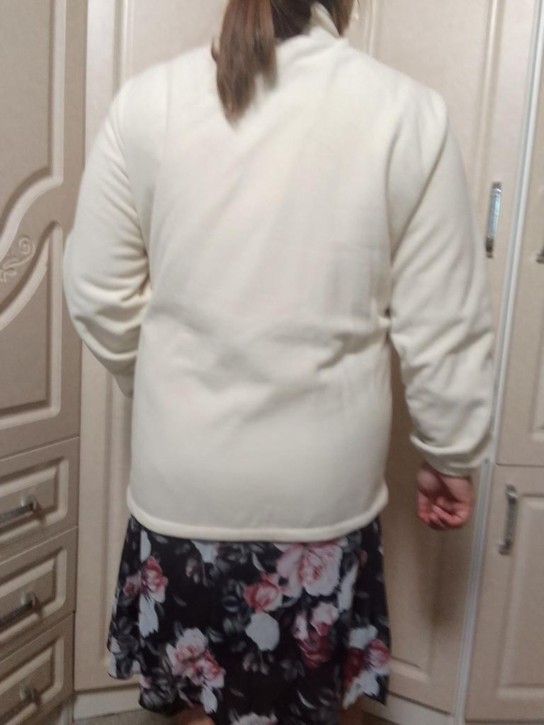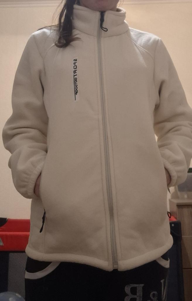 La felpa non è male, non è bianco candido, è in pile. Ha tasche interne. Porto la taglia 42, ho preso la M per averla un po' più ampia. La indosserò.