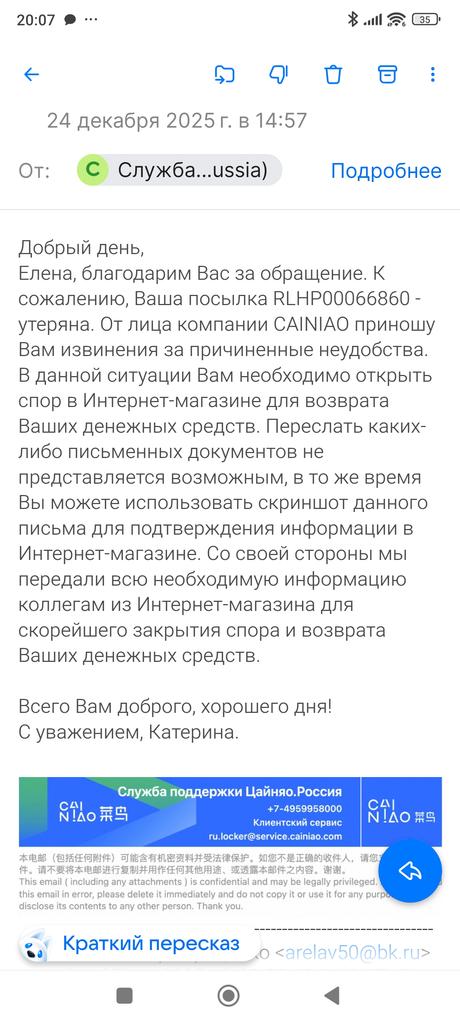L'ordine è stato smarrito dalla compagnia CAINIAO. Chiediamo il rimborso..