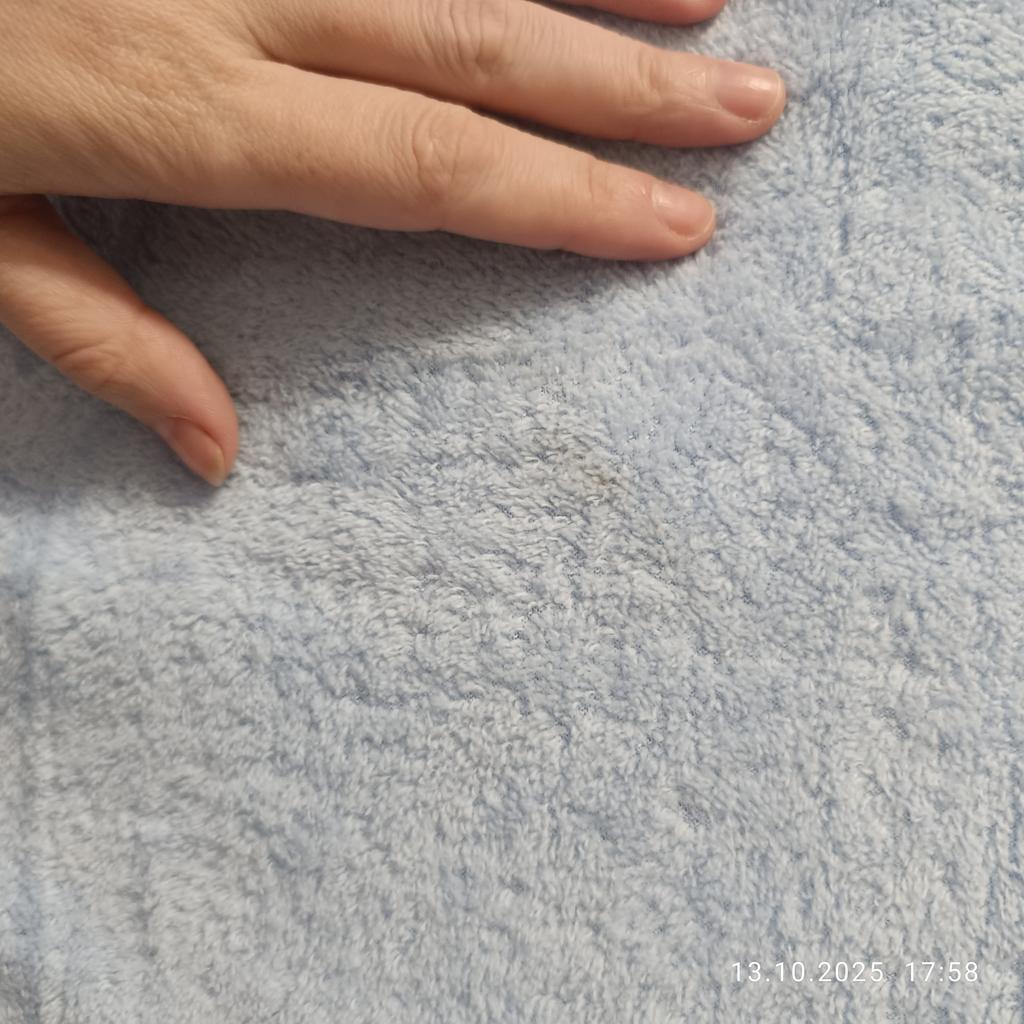 L'asciugamano è super, morbido, confortevole, ma c'è una sfumatura, sulla schiena c'è una macchia sporca, speriamo che vada via dopo il lavaggio