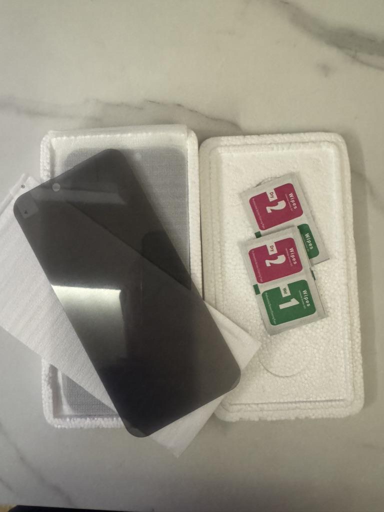 Tutto come nella foto del sito. Tutto intero. Facile da incollare, oscuramento C'è, per questi soldi, Quelli più costosi oscurano meglio, Face ID non sempre funziona bene.