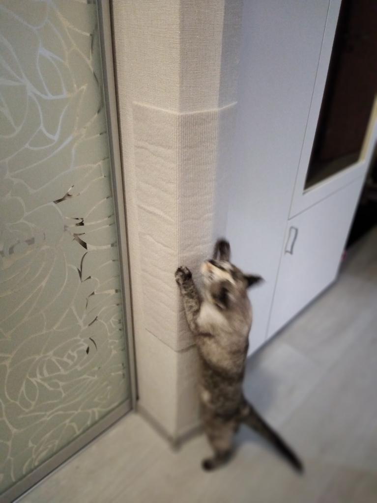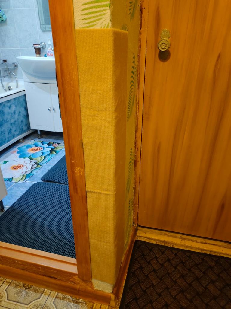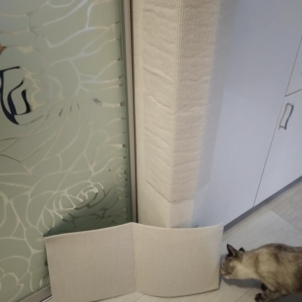 L'ho attaccato all'angolo del muro. I gatti corrono fino al soffitto. Non si è attaccato molto bene, ma è rimasto ancora un po' di colla.