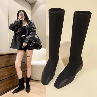 Scarpe da Donna in Saldo 2024 Nuovi Stivali da Donna a Gambale Invernale Punta Quadrata Camoscio Tinta Unita Tubo Alto Piatti Elasticizzati Zapatillas Mujer