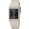 The strap is made from a soft resin band that complements the ivory dial, providing a comfortable fit and a clean aesthetic. The adjustable buckle ensures a secure fit for different wrist sizes.