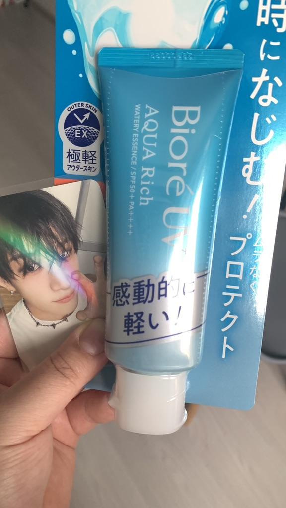Essenza impermeabile, Giappone. Biore UV Aqua Rich Watery Essence è un'essenza waterproof a base d'acqua, dalla consistenza leggerissima e impalpabile. L'essenza non ostruisce i pori, dopo l'applicazione la pelle diventa morbida e setosa, con un finish opaco. Contiene estratti di agrumi, acido ialuronico e pappa reale per idratare la pelle. Contiene una piccola quantità di alcol per stabilizzare i filtri e alleggerirne la consistenza. Perfetto come base per il trucco. Il fattore di protezione SPF 50+ blocca completamente i raggi ultravioletti, proteggendo dai raggi UV dello spettro A (fotoinvecchiamento) e dello spettro B (scottature e pigmentazione). Ha un aroma fresco e fruttato. Fornisce una protezione solare di lunga durata; Completamente resistente all'acqua e al sudore per 80 minuti; Idrata la pelle ed è facile da applicare, può essere utilizzato come base per il trucco; Il prodotto ha una texture leggera, dona una sensazione di freschezza e refrigerio quando applicato sulla pelle; Non lascia traccia bianca. Filtri chimici Applicazione: applicare quotidianamente, prima di uscire. Può essere utilizzato anche su tutto il corpo. Non utilizzare su pelle irritata o danneggiata.. Lo consiglio vivamente.👍