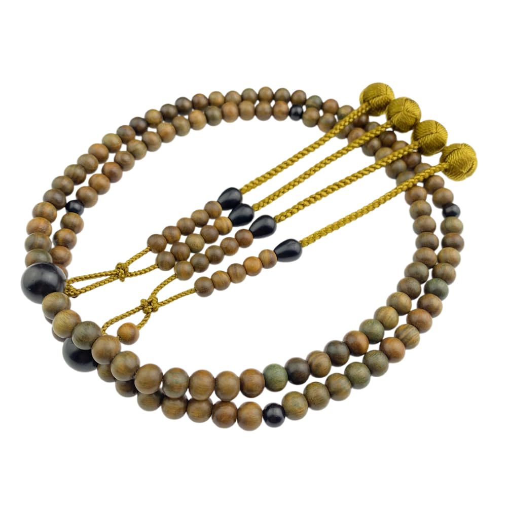This is an official prayer bead for men of the Shingon sect. The material is Lignum vitae, a broad-leaved tree belonging to the Tribulaceae family. Famous as the heaviest tree in the world, it is hard and durable, and the treated surface has a waxy luster. As it ages, it turns dark greenish-brown and is used to make seals, prayer beads, walking sticks, etc. Lignum vitae means "tree of life" in Latin, and in Europe the resin has been treated as a medicine that can cure all kinds of illnesses. It is not dyed and is made from natural wood, and has a nice scent of sandalwood. The more you use it, the more the color becomes glossy, giving it a shine and calmness just like natural stone. The tassels are made of Odamaki Sanskrit tassels, which are durable, easy to handle, and do not lose their shape.