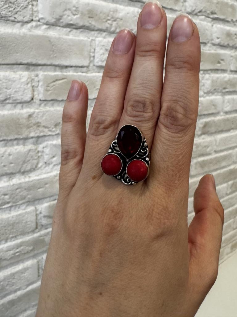 Natural Garnet, Coral Gemstone 925 Sterling Silver Jewelry Ring Size 5.5 o0M81
