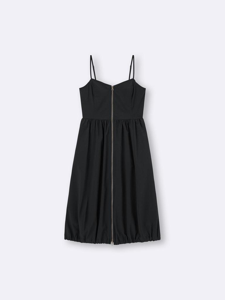 The GU by Uniqlo Front Zip Bubble Hem Dress features a front zip that can be opened and closed, and an adjustable slit depth, making it an attractive piece of clothing. The skirt part has a rubber waistband, creating a voluminous silhouette. The shoulder straps come with an adjuster that allows for length adjustments, ensuring comfort. This product is made using recycled materials, promoting sustainable fashion.