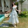 French V-neck Pleated Women's Dress with Elegant Puffed Sleeves and A Cinched Waist