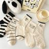 5 Pairs Women Cartoon Dog Pure Striped Mid Length Socks For Women Cute Sweet Academy Style Socks