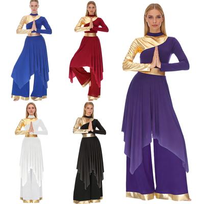Womens Church Dance Outfit Asymmetrical Hem Long Sleeve Metallic Patchwork Dress Wide Leg Pants Worship Performance