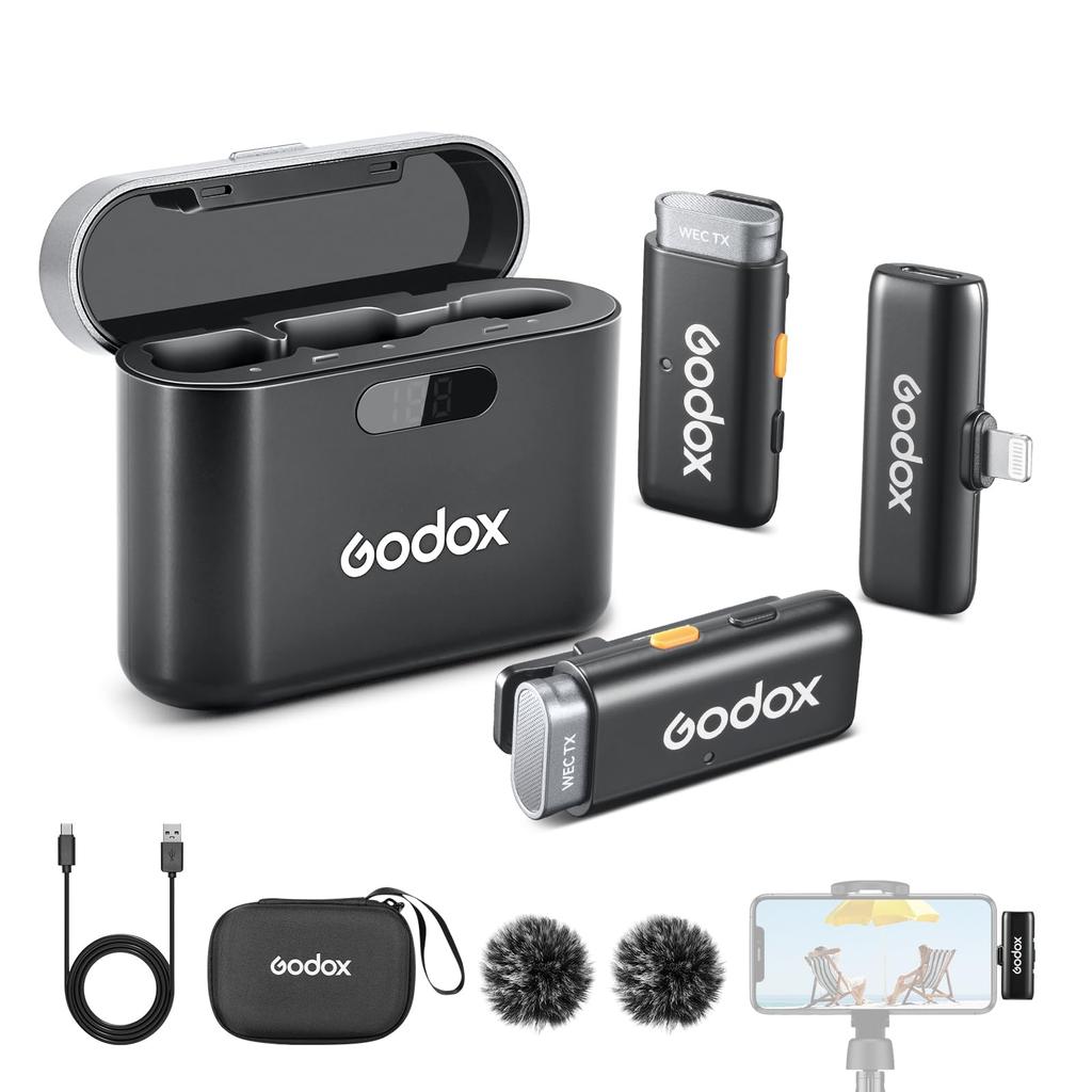 Godox Kit WES12 Microfono Wireless per Microfono Wireless con Trasmissione a 200m Custodia di Ricarica con Cancellazione del Rumore per Vlogging e TikTok iPhone/Lightning,