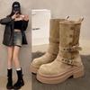 Stivali Alti da Donna 2025 Primavera Nuovo Stile Alla Moda Risvolto a Due Pezzi Stivali a Metà Polpaccio Retrò Versatili con Suola Spessa Stivali da Moto