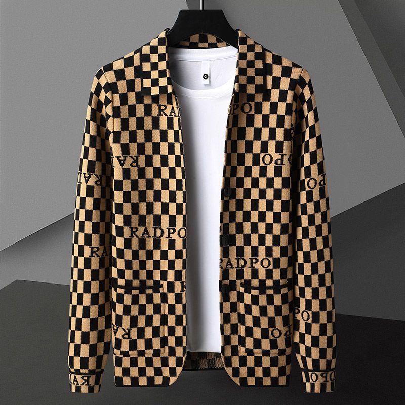 Smart Casual English Elements Plaid Panelled Turn-down Collar New Men Coat Fashion Casual Knit Loose Pockets Cardigan Jacket