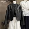 Pu Leather Lace-up Short Jacket for Women Fashion Lapel Long Sleeves Irregular Coat Ladies Office Commute Outwear