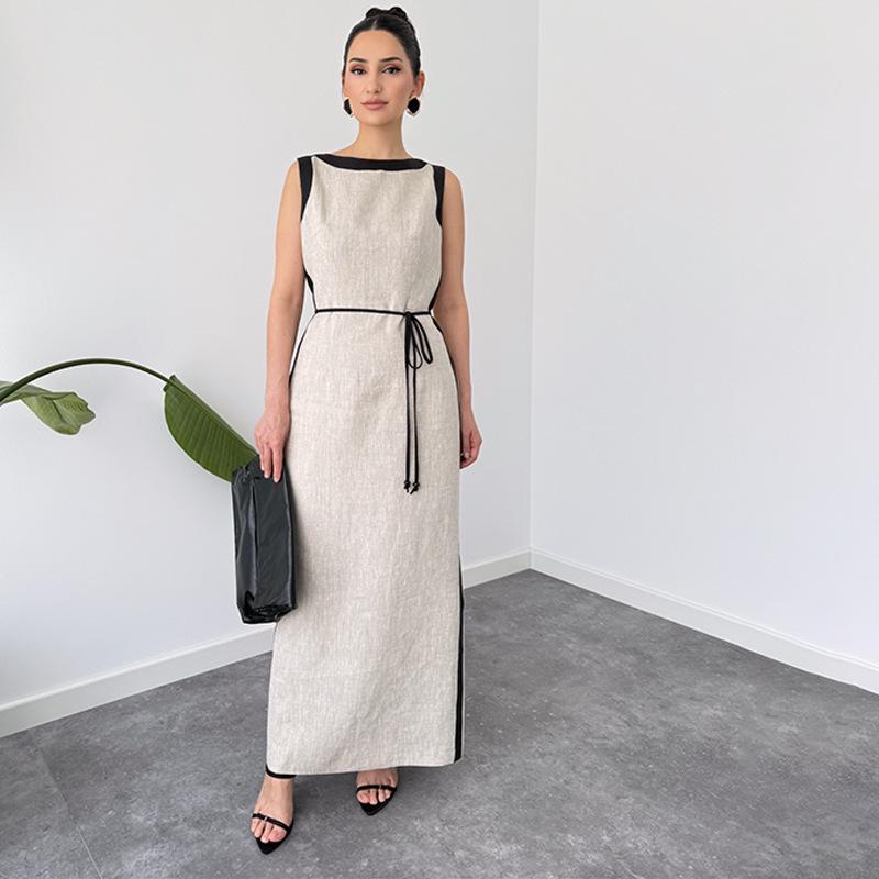 2025 Autumn Women's Colorblock Sleeveless Crew Neck Tie-Up Slit Dress