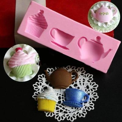 3 Cavity Silicone Teapot Cup Cupcake Fondant Mold Baking Tray Cake Decor Tool