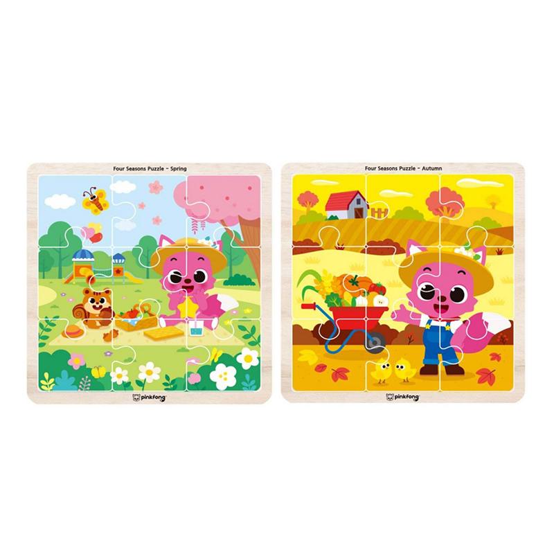 Un puzzle di legno colorato a doppio set che raffigura scene di Primavera e Autunno dal mondo di Pinkfong.