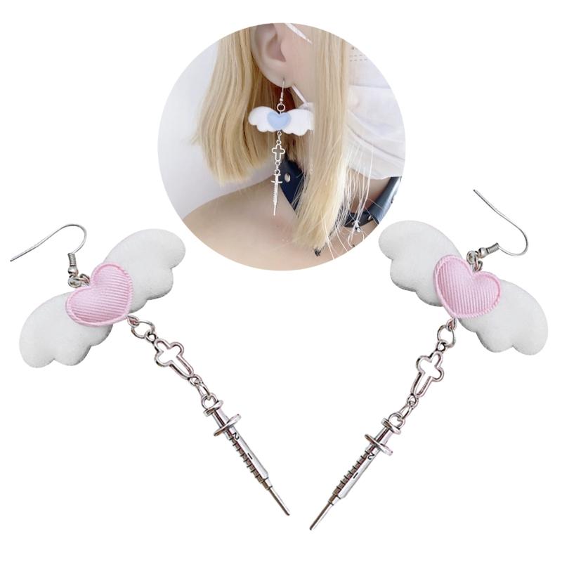 Unique Gothic Earwear Fashion Angel Wing Heart Earrings Y2k Aesthetics Jewelry Crucifix Syringe Ear Hooks/Ear Clips