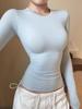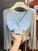 Milk blue shoulder shirt women's waist pinch pleated irregular short top spring bottoming shirt long sleeve inner
