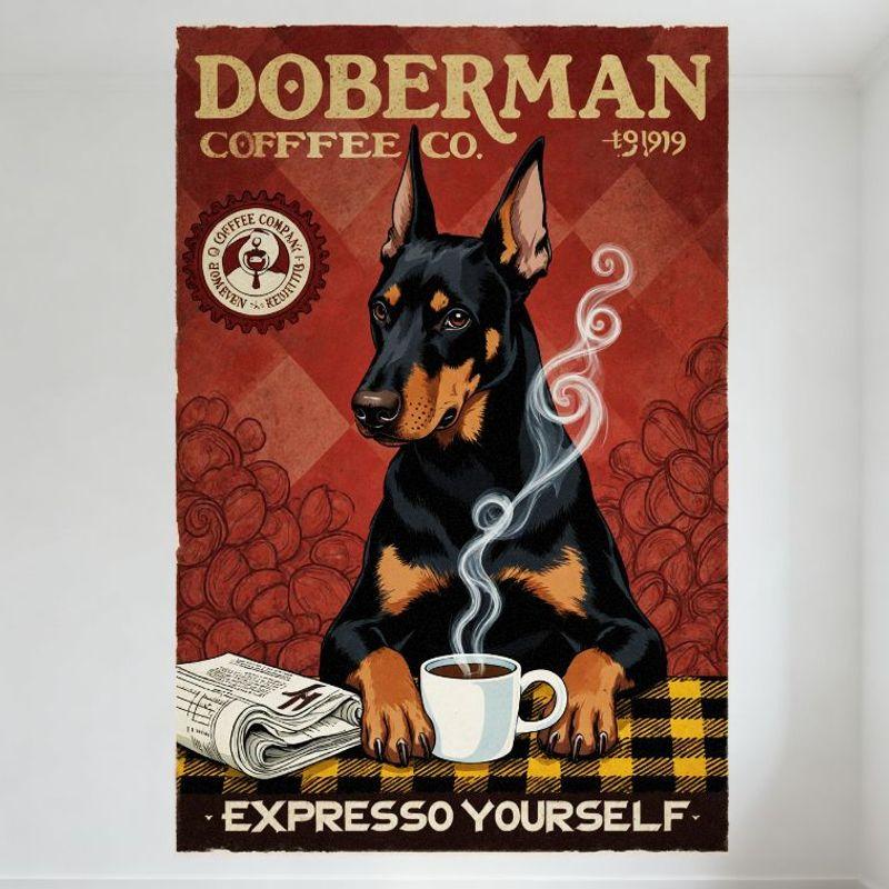 Vintage Doberman Coffee Co. Metal Tin Sign - 1919 Established Doberman Pinscher with Coffee Cup & Newspaper, Retro Wall Decor fo
