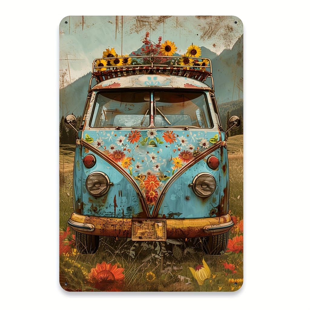 Vintage Floral Bus Metal Tin Sign, Iron Wall Decor for Gym, Cafe, Garage, Restaurant, Home, Bedroom - Indoor & Outdoor Retro Flo