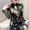 Retro Button-printed Bottoming Shirt for Women In Autumn and Winter Chinese Style Cheongsam Top Hollow Mesh Long Sleeve T-shirt