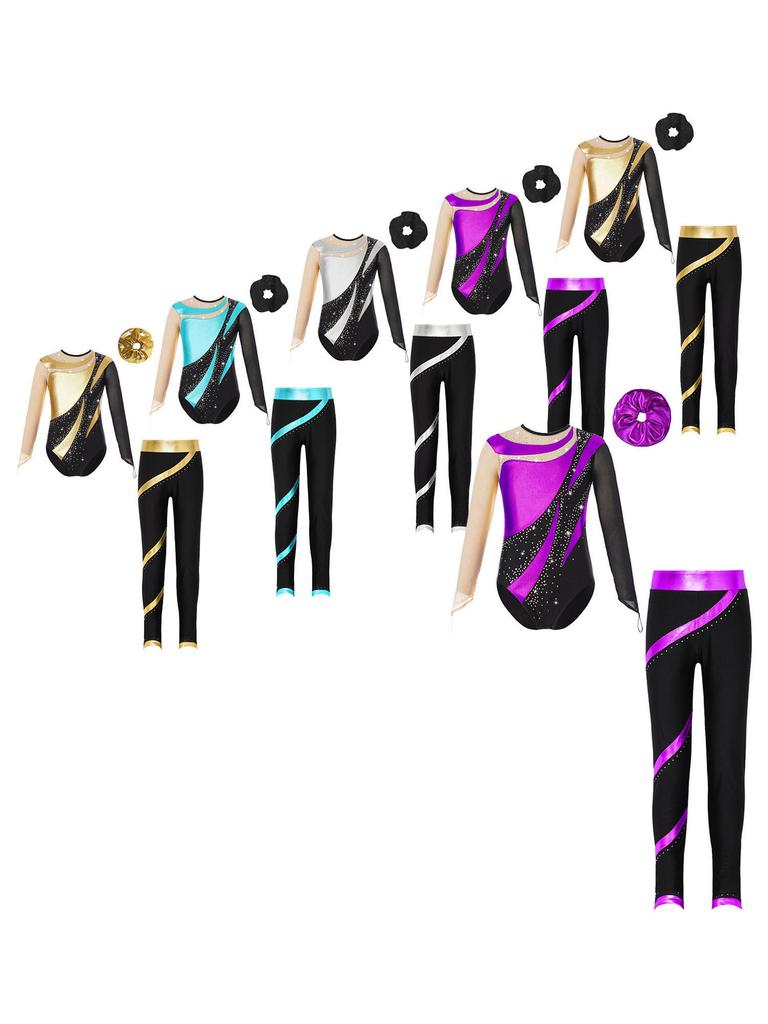 Completo body lucido con strass per bambina con schiena traforata manica lunga, pantaloni, fascia, outfit da performance