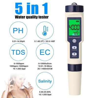 Penna digitale 5 in 1 PH TDS EC Meter Salinità Temperatura Tester Conducibilità Filtro acqua Penna per purezza con retroilluminazione
