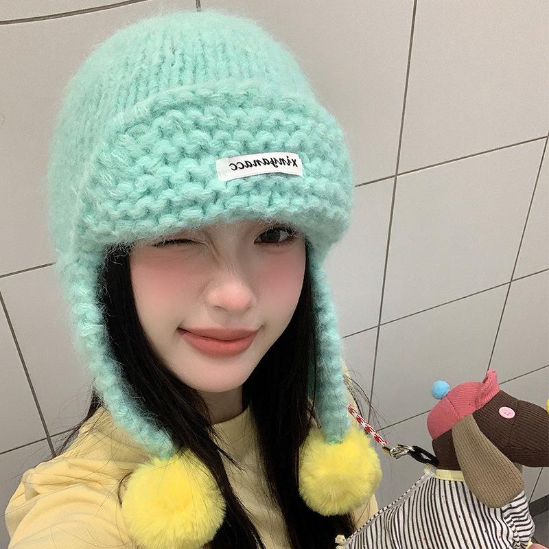 Cute green knitted hairball ear protection hat women's autumn and winter Korean flying hat wool hat warm Lei Feng hat tide