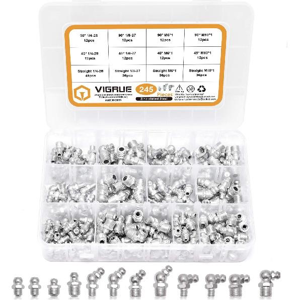 VIGRUE Grease Fittings, 245 Pieces SAE & Metric Grease Fitting Assortment Kit, Standard Grease Fittings Grease Zerks, Straight and Angled Perfect for