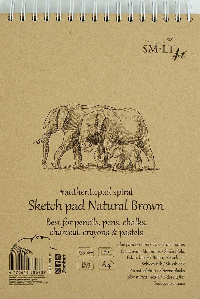 Brown natural sketching paper. 100% recycled paper. 135 gsm. Made in Europe. Brown natural paper with a natural texture, perfect for all kinds of sketching. The brown background is perfect for pencils, pens, chalk, charcoal pencils, crayons, and pastels. Spiral binding (top ring) Can be torn off one by one along the perforation at the top A4 size 210x297mm 80 sheets bound The inner paper is FSC certified (environmental conservation and forest management) This product is for those who are particular about the quality of the paper and the feel of writing, and who want to use, hold, and preserve their work in a stylish way. SM/LT Art is a unique brand. High-quality sketchbooks for all artists. Delivered from Lithuania, a land of forests and lakes in Europe. The "Authentic" series features sketchbooks made with genuine paper and stylish cover designs, perfect for a variety of art and craft projects. This product is for those who value paper quality and a smooth writing feel, and who want to use, keep, and preserve their work in a stylish way. The beige "elephant" cover design features brown natural paper with a natural texture, perfect for any sketch. The brown background complements pencils, pens, chalk, charcoal pencils, crayons, and pastels.