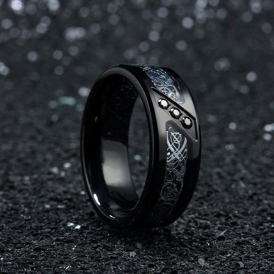 Fashion 8mm Men Stainless Steel Celtic Dragon Rings Inlaid Black Zircon Stone Wedding Band Gift For Men