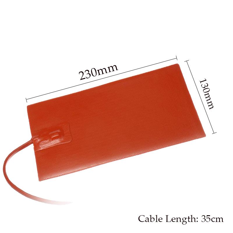 Specification:Name: Silicone Engine Pan Heater Plate PadMaterial: Silicone&AlloyPad Size: 230x130mmCable Length: 35cmVoltage: 12VPower:100WTemperature: Constant temperature 40°, 60°, 80°, 100°, 120°, 150° Features:1.It is mainly composed of nickel-chromium alloy electric heating wire and silicone rubber high-temperature insulation cloth. The silicone rubber heating plate is very thin, light in weight and flexible. It can be completely in close contact with the object to be heated, allowing heat to be transferred to any desired place, improving heat transfer during processing, accelerating heating and reducing power requirements. It has good waterproof performance, fast heating, uniform temperature, high thermal efficiency, and good toughness.2.The insulation layer of the silicone rubber heating plate is composed of silicon rubber and glass fiber cloth, which has high insulation performance and a breakdown voltage of 20 ~ 50KV / mm.3.The double-sided adhesive on the back can be directly attached to the product to be heated. The maximum resistance is 200 ° and it does not fall off. Installations:1.Can be bonded with pressure-sensitive adhesive on flat and smooth workpieces.2.The maximum operating temperature of the pressure-sensitive adhesive is: 150 ° C continuous, 230 ° C instant. Where the power density does not exceed 0.9W / c㎡. Warming:1.When using this type of electric heating device, care must be taken that its continuous use working temperature should be less than 240 ° C and instantaneous not exceed 300 ° C.2.Silicone electric heating device can work and under pressure, that is, it can be pressed against the heated surface with auxiliary pressure plate. The heat conduction is good. When the temperature in the working area does not exceed 240 ℃, its current density can reach 3W / c㎡.3.The operating temperature is allowed to be less than 150 ℃ under paste installation conditions.4.In the case of air dry burning, the power density should be less than 1 W / c㎡ due to the temperature resistance of the material; in non-continuous working conditions, the power density can reach 1.4 W / c㎡.5.The working voltage is selected on the principle of high power-high voltage, low power-low voltage, and special needs can be excluded. Package Include:1 x Heater Pad