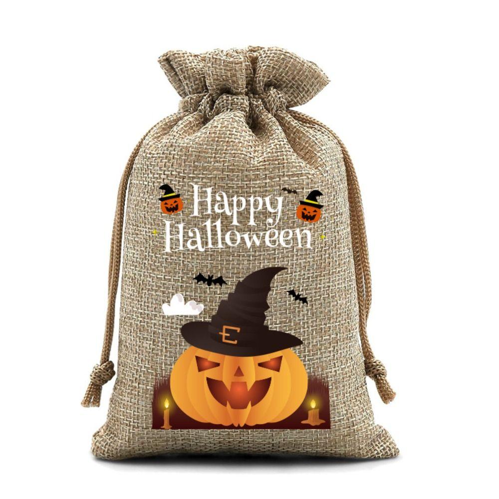 12Pcs Pumpkin Ghost Halloween Linen Drawstring Bags Handheld Portable Trick or Treat Candy Bag Creative Party Prop