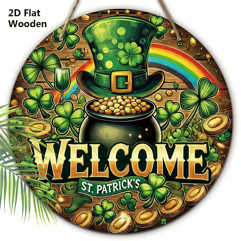 St. Patrick's Day Pot of Gold Welcome Wooden Sign, Round Front Door Decor, Lucky Clover & Rainbow Wall Hanging - Ideal for St. Paddy's Day