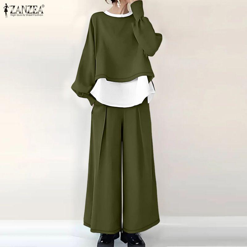 ZANZEA Women Casual Long Sleeve Blouse and Wide Leg Pants Two Piece Suit Sets